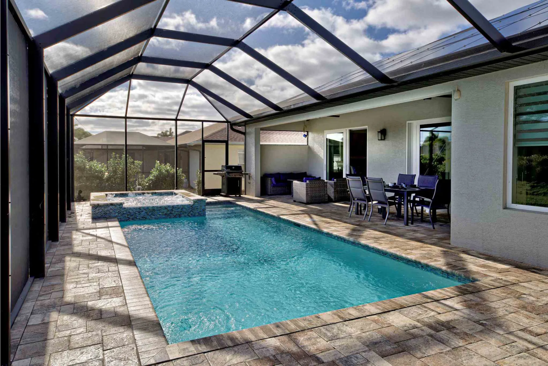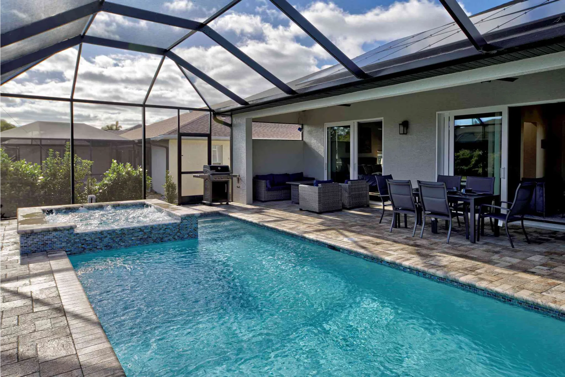 Das Haus ist mit Designer Möbel eingerichtet, welche einen schon beim Betreten des Hauses zum Wohlfühlen einladen. Auf der teilweise überdachten Terrasse befindet sich ein beheizbarer Pool mit integriertem Whirlpool, ein Esstisch für 6 Personen, eine Rattan Lounge inkl. Fire Pit für 5 Personen und 4 Liegestühle zum Sonnenbaden.